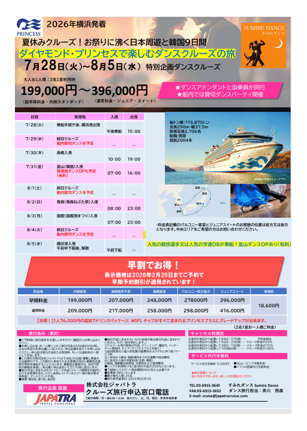 涼しくなってきた頃にぴったりのダイヤモンドプリンセスダンス旅行です。大人気の女性アテンダントカテリンが乗船します。男性のお客様、トライアル奮ってご参加お待ちしております。