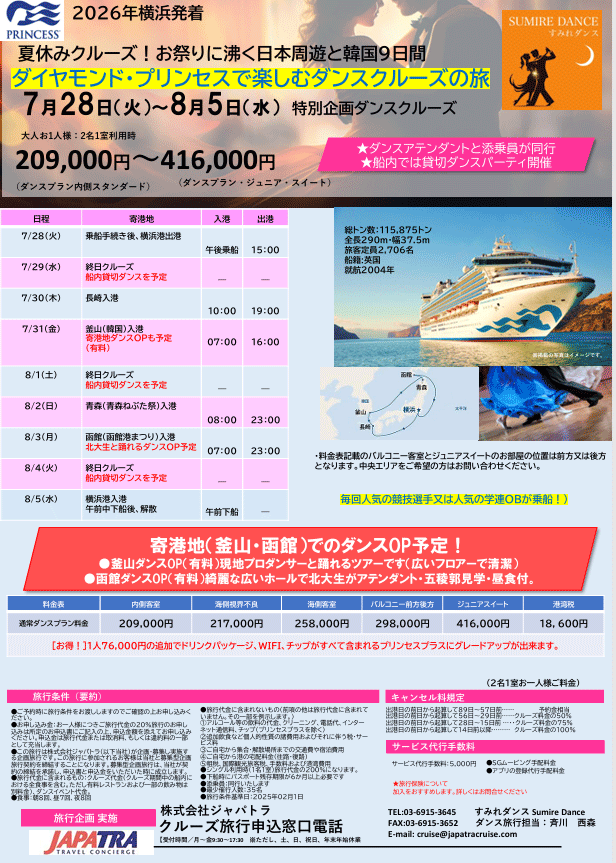 涼しくなってきた頃にぴったりのダイヤモンドプリンセスダンス旅行です。大人気の女性アテンダントカテリンが乗船します。男性のお客様、トライアル奮ってご参加お待ちしております。残室僅かです。