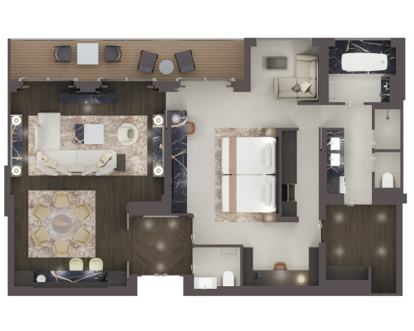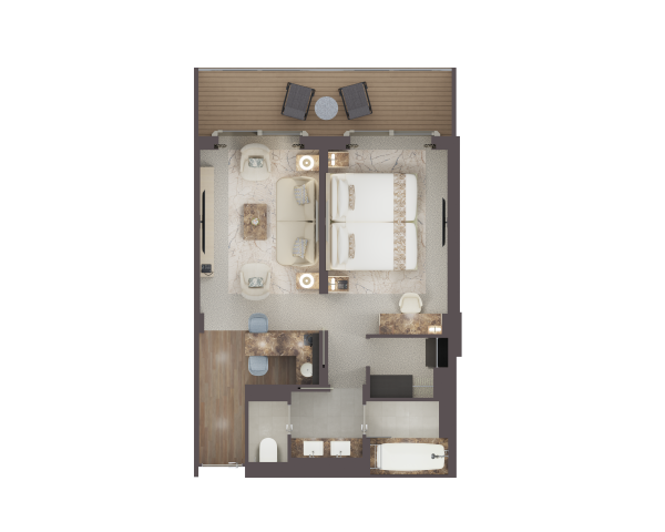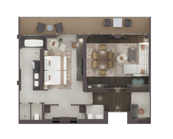 リビングエリア/ミニバー(シンク付き)/プライベートバルコニー/セパレートベッドルーム/ツインベッド(ソファベッド1台、一部客室のみ)/バスタブ/ダブルボウル洗面台/シャワー付きトイレ/ウォークインクローゼット/テレビ(リビングエリア、ベッドルーム)/冷蔵庫/電気ケトル/加湿器/金庫/ドライヤー/バスアメニティ/スキンケア/バスローブ/風呂敷/タブレット端末