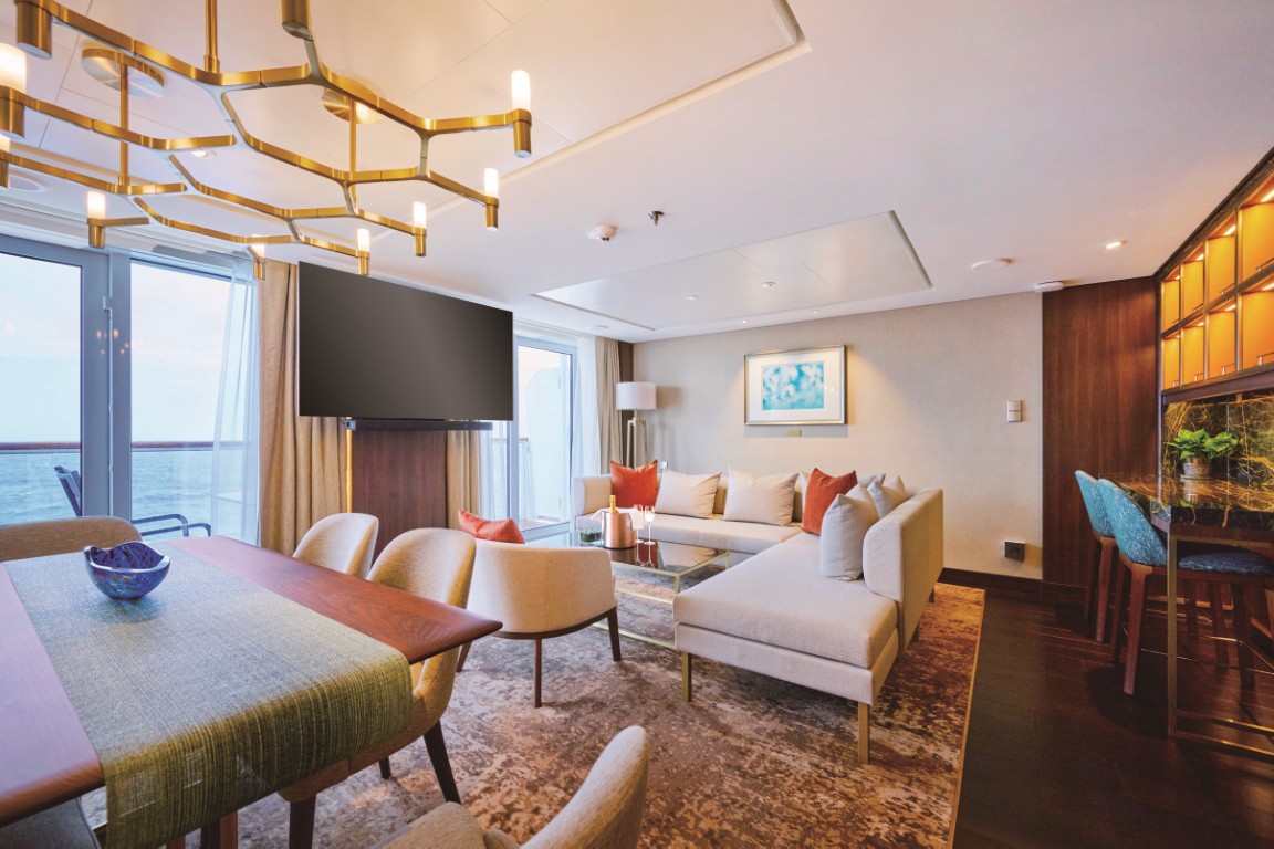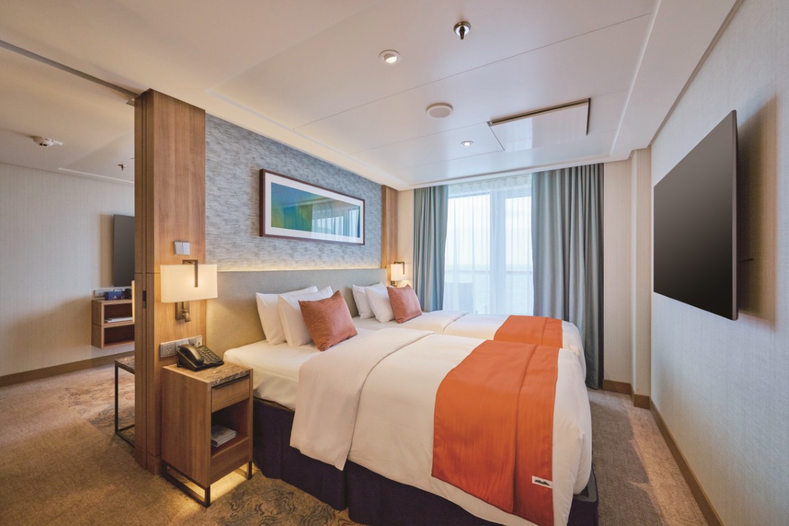 リビングルーム/ダイニングエリア(シンク付き)/プライベートバルコニー/セパレートベッドルーム/ツインベッド(スタッキングベッド2台)/サンルーム/書斎/マルチスペース/バスルーム(海側/バスタブ、洗い場付き)/シャワーブース/ダブルボウル洗面台/シャワー付きトイレ/ゲスト用トイレ/ウォークスル ー クロ ー ゼット/ テレビ( リビングルーム、ベッドルーム)/ワインセラー/冷蔵庫/電気ケトル/加湿器/金庫/双眼鏡/ドライヤー/バスアメニティ/スキンケア/バスローブ/パジャマ/乾燥機能付き洗濯機/風呂敷/タブレット端末