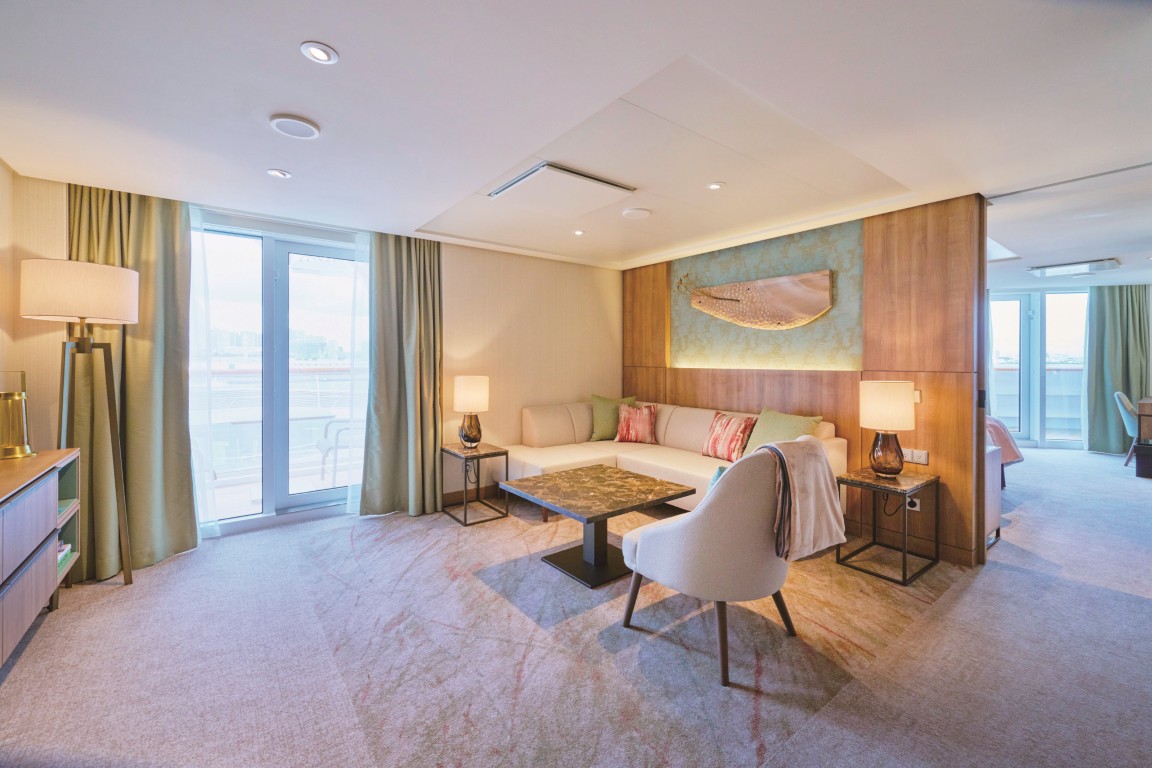 リビングエリア/ミニバー(シンク付き)/プライベートバルコニー/セパレートベッドルーム/ツインベッド(スタッキングベッド1台)/バスルーム(海側/バスタブ、洗い場付き)/ダブルボウル洗面台/シャワー付きトイレ/ウォークインクローゼット/テレビ(リビングエリア、ベッドルーム)/冷蔵庫/電気ケトル/加湿器/金庫/ドライヤー/バスアメニティ/スキンケア/バスローブ/風呂敷/タブレット端末