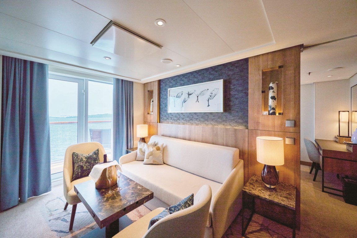 リビングエリア/ダイニングスペース(シンク付き)/プライベートバルコニー/セパレートベッドルーム/ツインベッド(スタッキングベッド1台)/バスルーム(海側/バスタブ、洗い場付き)/ダブルボウル洗面台/シャワー付きトイレ/ウォークインクローゼット/テレビ(リビングエリア、ベッドルーム)/冷蔵庫/電気ケトル/加湿器/金庫/ドライヤー/バスアメニティ/スキンケア/バスローブ/風呂敷/タブレット端末