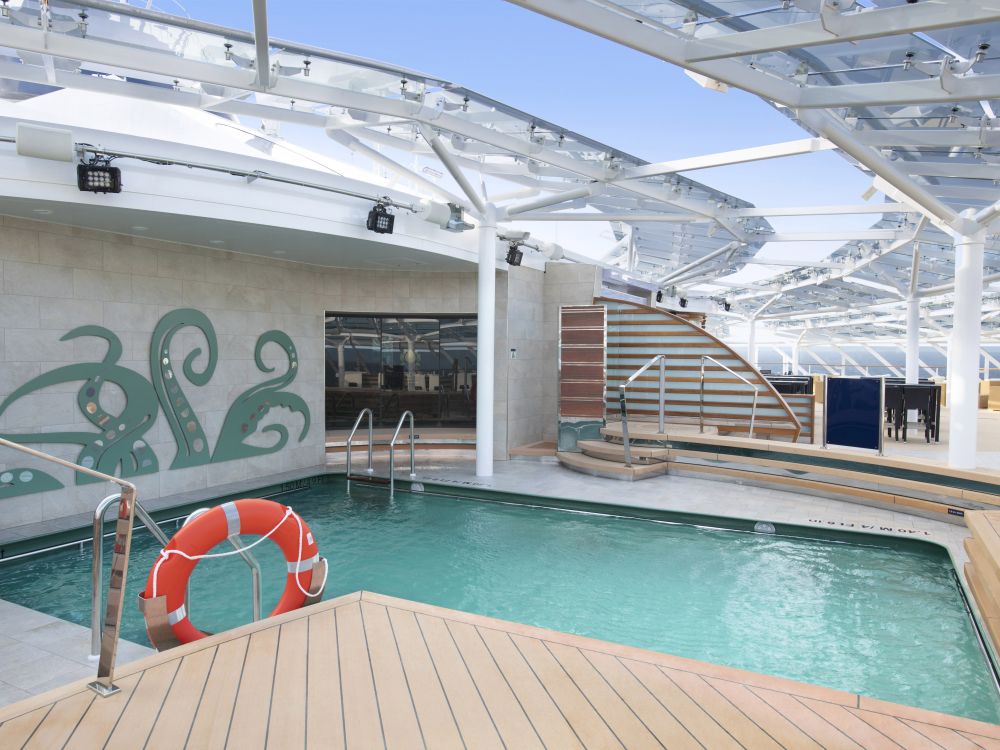 船内には巨大なスクリーンを備えた「アトモスフィアプール」(写真)や、船尾に位置する「ホライゾンプール」の屋外プールだけでなく、屋内の「グランドキャニオンプール」もあり、数か所あるジャグジーもお楽しみいただけます。